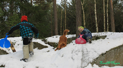 Så gikk vi en tur opp i skoen der SFO på den lokale skolen har lagd en stor lavo, og der ble det litt aking og moro, så etter ett par tre timer satte vi nesa hjem til middag som etter guttenes ønske var pølse og potetstappe.