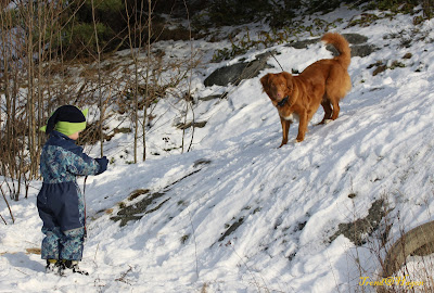 Ellers har det vært to nevøer på besøk her i helgen, og på fredagskvelden fikk den eldste av dem være med på kveldstur sammen med Per og Oscar (minsten sov) og gutten har anlegg for og bli hundetrener, utstyrt med hundegotterier hadde han 2 tollertroll i sin hule hånd, og de satt og dekket og ble sittende med glans i håp om litt godterier fra barnehånd 🙂 og guttungen storkoste seg med kontroll på hundene, litt gjemsel ble det også, men det var nok ikke lett og gjemme seg for 2 skarpe neser.