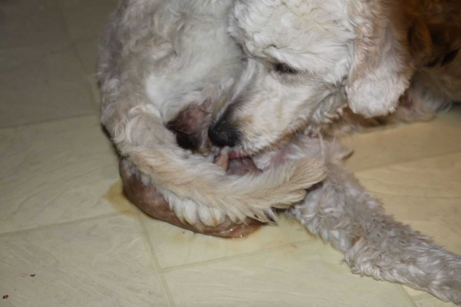 Ariel hadde helt tydelig fått den siste på kjøkkengulvet, men forsiktig slikket den ren og selv tatt den med opp i valpekassen sammen med de andre, Flinke Ariel.